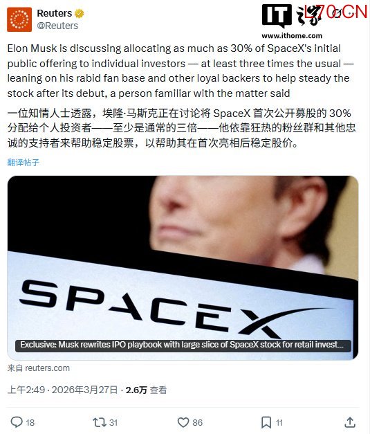 IT之家 3 月 27 日消息,据路透社今日报道,马斯克正考虑在 SpaceX 的首次公开募股中期货交易资讯平台,将高达 30% 的份额分配给个人投资者。