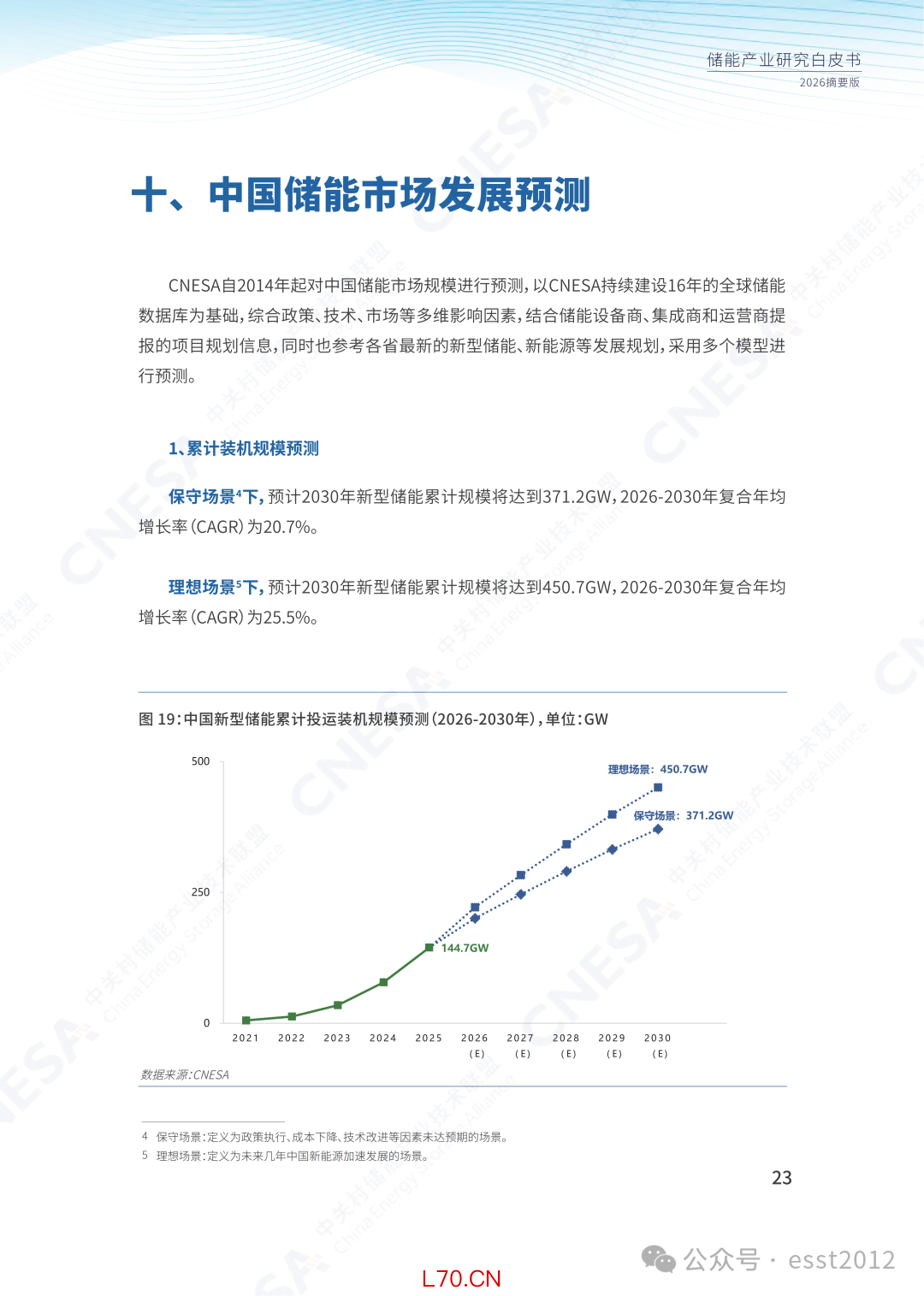 CNESA自2014年起对中国储能市场规模进行预测。此次发布的白皮书中,CNESA结合保守场景1与理想场景2,对 2026-2030 年中国新型储能市场规模的预测如下: