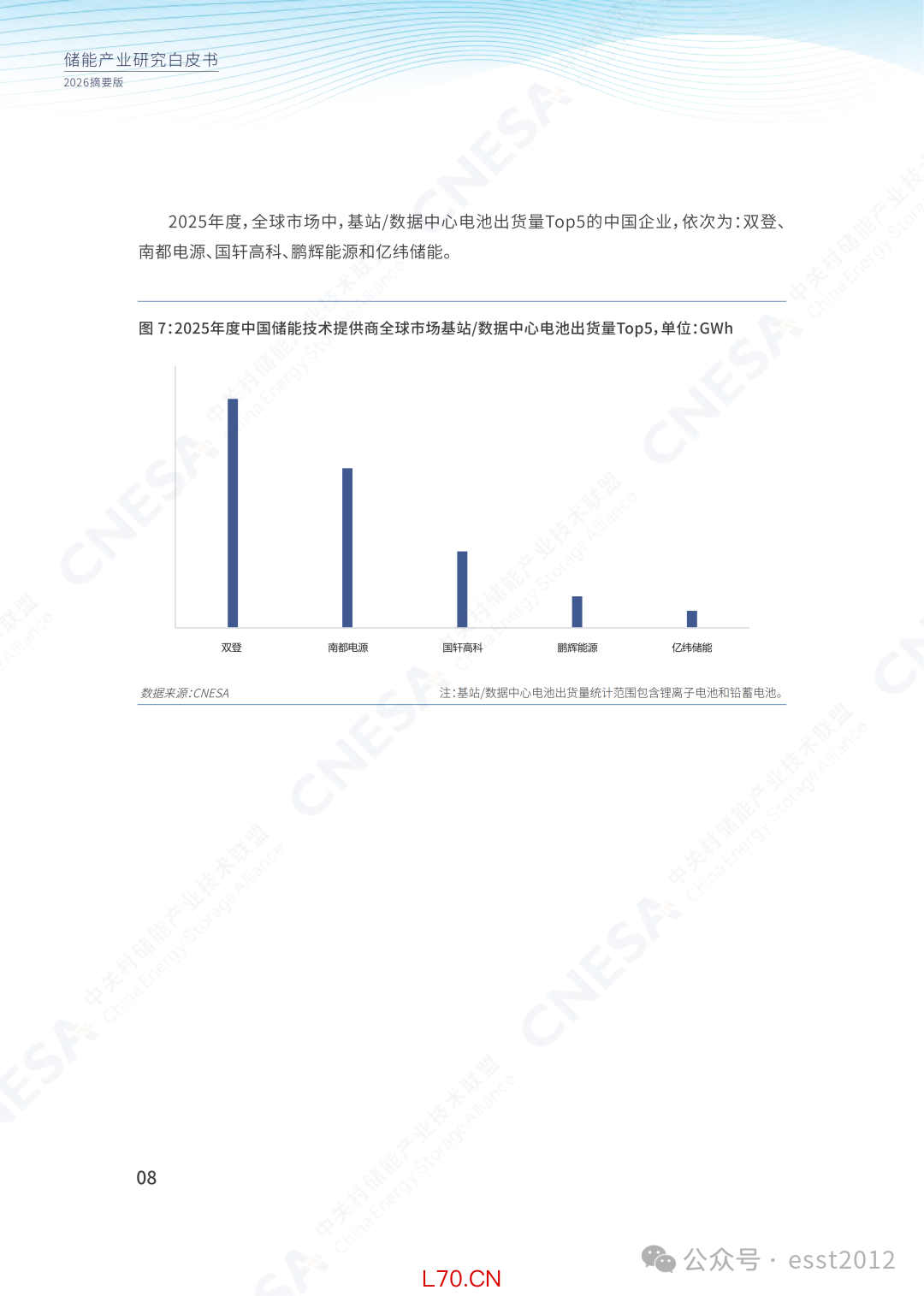 图7:2025年度中国储能技术提供商全球市场储能电池出货量Top10,单位:GWh2025年度,全球市场中,基站/数据中心电池出货量Top5的中国企业,依次为:双登、南都电源、国轩高科、鹏辉能源和亿纬储能。