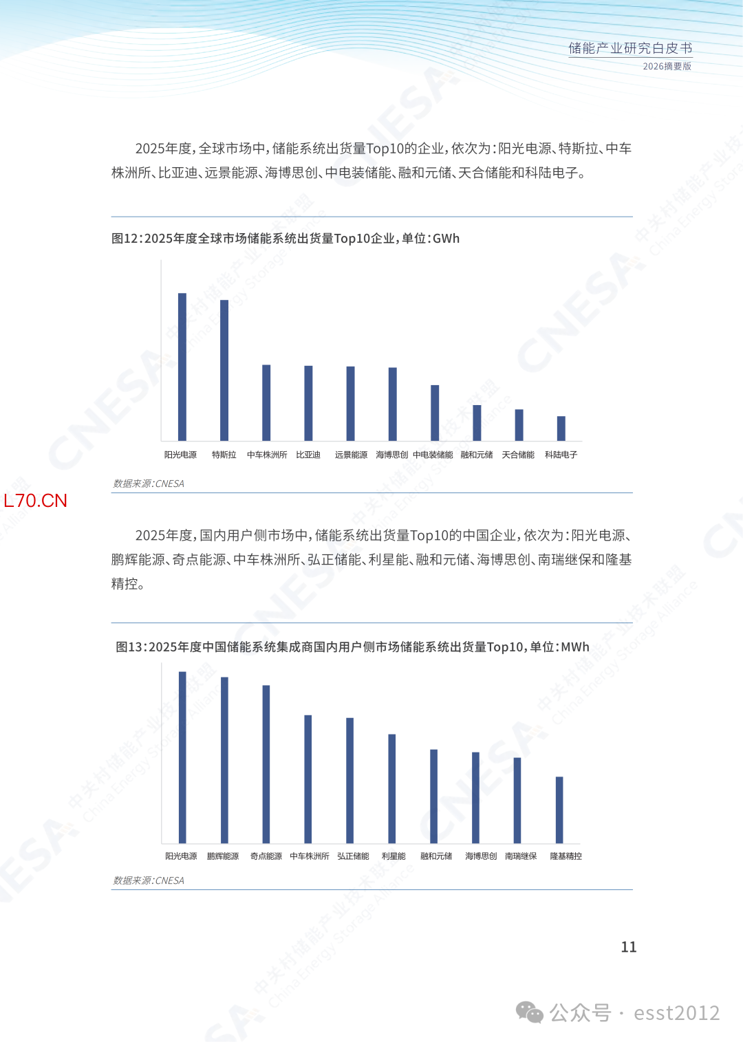图12:2025年度中国储能系统集成商国内市场储能系统出货量Top10,单位:GWh2025年度,全球市场中,储能系统出货量Top10的企业,依次为:阳光电源、特斯拉、中车株洲所、比亚迪、远景能源、海博思创、中电装储能、融和元储、天合储能和科陆电子。