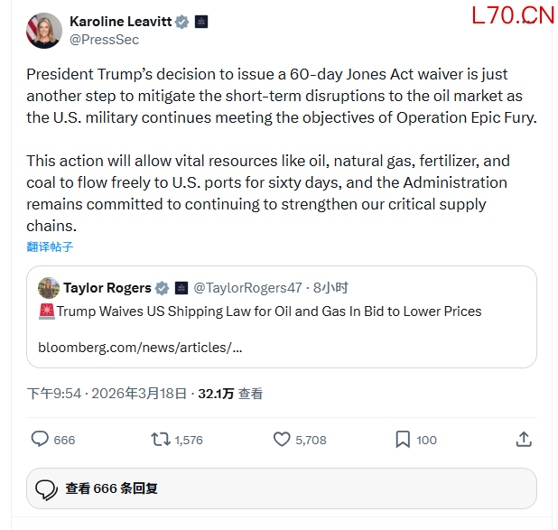 白宫新闻秘书卡罗琳·莱维特在一份声明中表示,暂时豁免《琼斯法案》“将允许石油、天然气、化肥和煤炭等重要资源在六十天内自由流向美国港口”。她还补充称,特朗普政府“仍然致力于继续加强我们的关键供应链”。