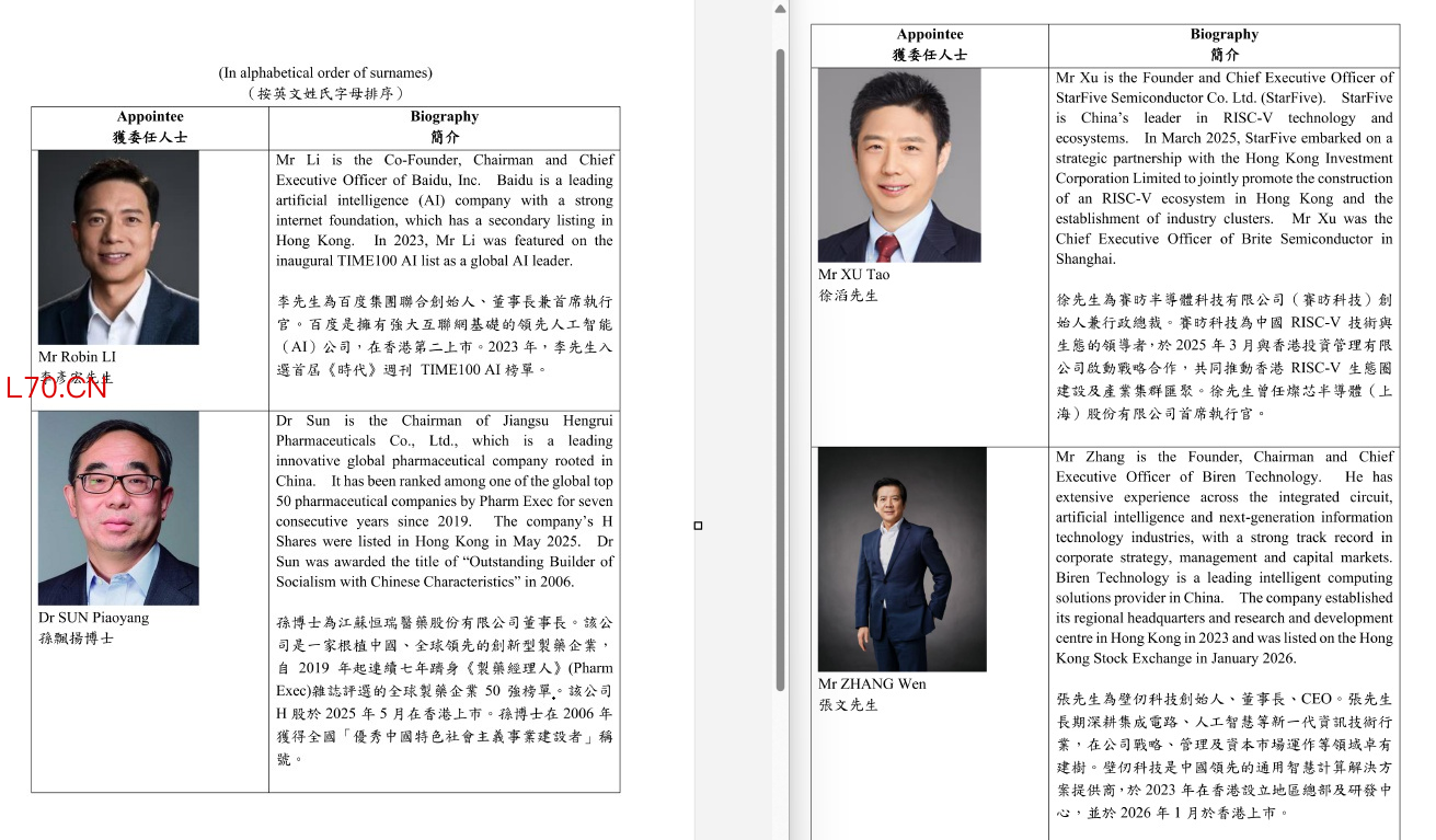 李彦宏等4人获委任为香港特首顾问团成员