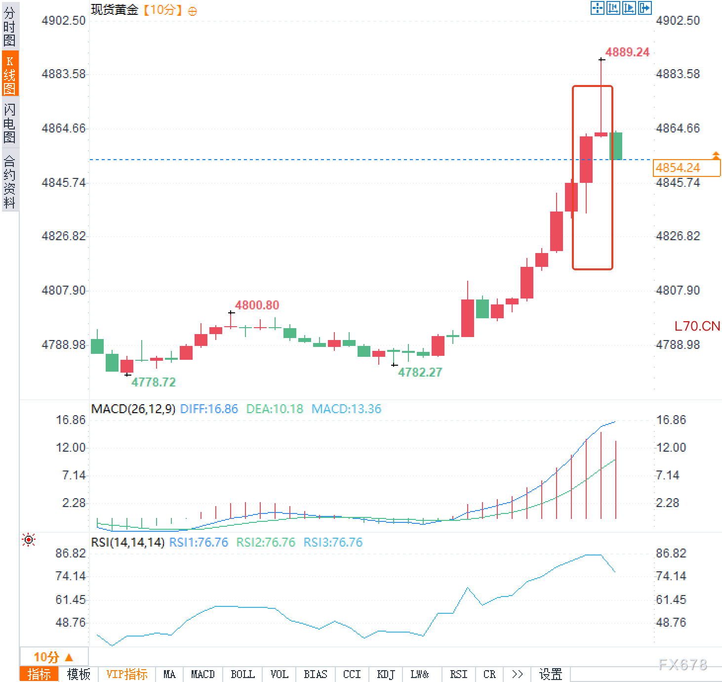 WTI原油期货一度下跌超过10美元/桶,报82美元/桶附近,跌幅超过11%。在此背景下,现货黄金价格围绕4850美元/盎司一线波动,短线冲高至4890美元后小幅回落,但整体展现出较强韧性,主要得益于油价回落引发的通胀预期下行,以及由此带来的利率路径预期调整。