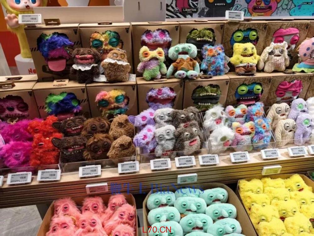 相比之下,旁边的FUGGLER(英国艺术家以Ebay假牙为灵感创作的丑萌玩偶),明显更受年轻消费者的青睐,不时有顾客拿起端盒端详。门店店员透露,店里目前销售情况最好的是FUGGLER系列,“这款比较另类和独特,很多年轻人喜欢。”